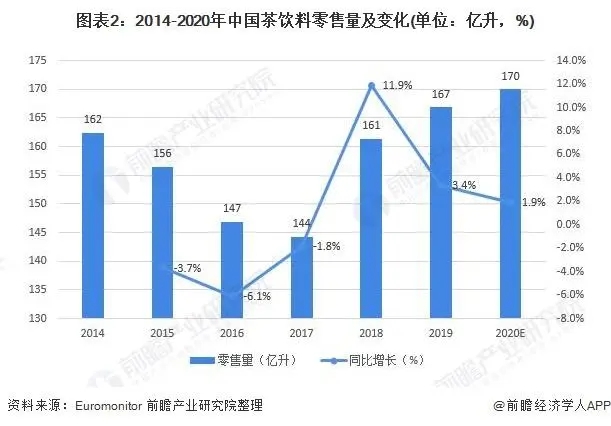 從我國茶飲料的生產情況來看,根據Euromonitor相關數據,2014-2019年我國茶飲料零售量呈現先降后增的波動趨勢,2019年我國茶飲料零售量約為167億升,同比增長3.4%;根據我國飲料行業整體行情初步判定,2020年中國茶飲料零售量約為170億升。