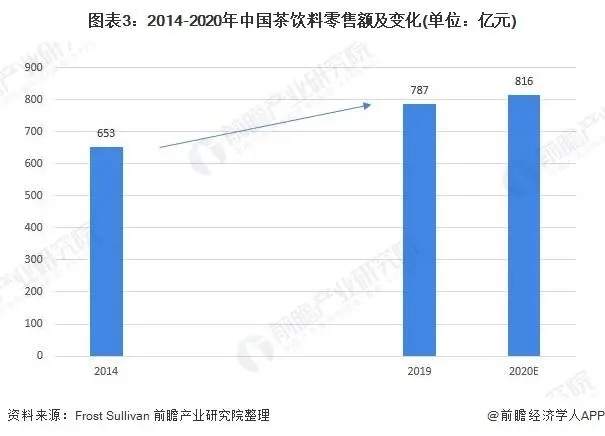 從我國茶飲料行業零售額變化情況來看,根據Frost & Sullivan統計數據,2014-2019年間我國茶飲料零售額呈增長之勢,從2014年的653億元增長到了2019年的787億元,年復合增長率約為3.8%;按照增速預計,2020年我國茶飲料零售額約為816億元。